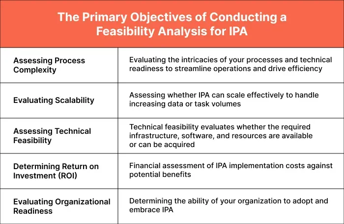 Alignment with Business Needs: Feasibility analysis determines if IPA aligns with your organization's specific needs and identifies the most beneficial processes for automation, focusing your resources for maximum impact.