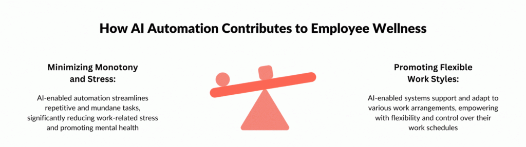 In the unanticipated ways AI-enabled automation is revolutionizing work, employee well-being takes center stage. Traditionally, automation may have been associated with concerns about job displacement and impersonal work environments. However, the reality is far from this apprehension. AI is redefining the workplace by fostering a more balanced and fulfilling work-life for employees.
