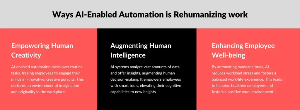 Throughout this exploration, we have witnessed the transformative power of AI-enabled automation in rehumanizing work. What was once perceived as a threat to human jobs has evolved into an enabler of human potential. AI takes on repetitive tasks, freeing time for employees to focus on creativity, critical thinking, and collaboration. This shift has fundamentally changed how we approach work, creating a more dynamic and fulfilling environment.