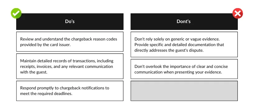 To increase their chances of successfully winning chargebacks, HMCs need to adopt a meticulous chargeback management strategy when gathering and submitting evidence. Here are some Do's and Don'ts to win more chargebacks: